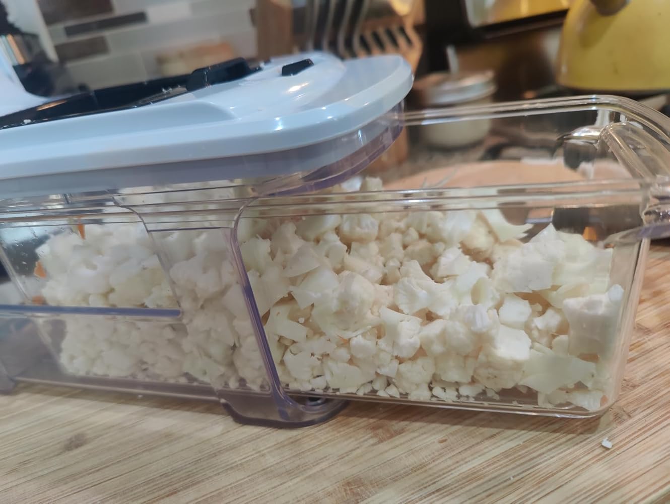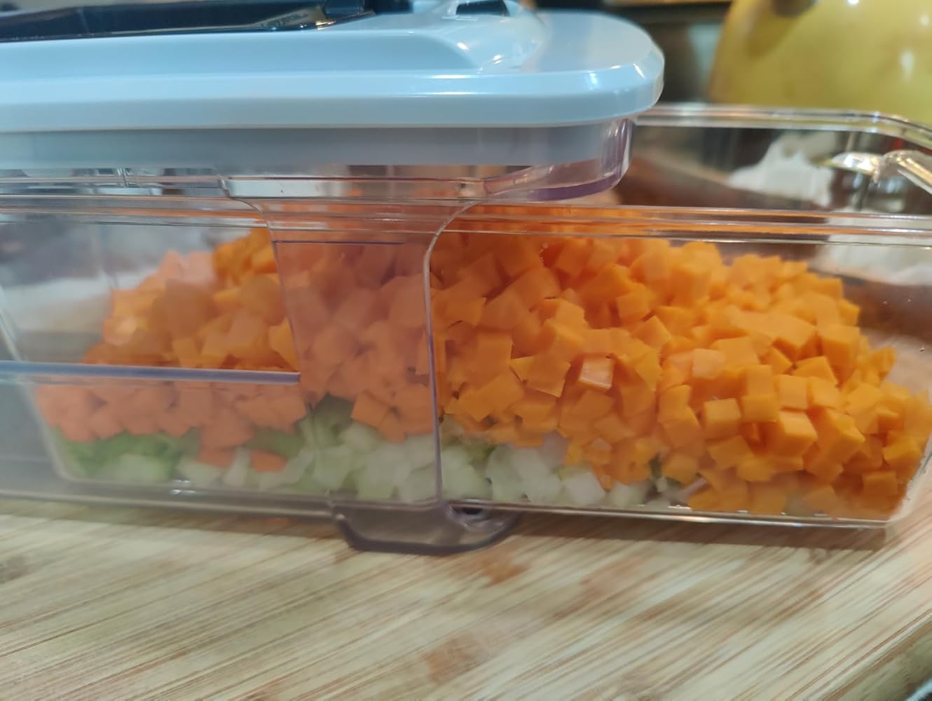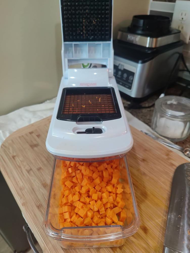 I've always been a little skeptical of these chop boxes but was looking for something to help prep large amounts of vegetables into consistent size pieces for soup season. I have decent knife skills but in recent years my grip strength has become a problem when dicing large volumes of veggies. I looked specifically for a box that could be used for multiple purposes. I loved that this one also came with mandoline and grater attachments.The first time I used this it was put to the test. Veggie prep for Wild Rice soup. Onion, celery and carrots. I wasn't overly concerned about the onion, wondered how it would handle the celery and doubted it could chop the carrots. It handled each vegetable I threw at it. With one caveat. With thicker and or denser veggies, it was critical to not overload the top tray before attempting to chop. With the carrots in particular, it takes a lot of quick force to push through the grate (Hulk Smash) If you enjoy using cooking to take out your aggression this product is perfect for you.The mandoline works beautifully for slicing onions thinly. The grater attachment is fairly useless. The grater plate is just far too small to be efficient. A standard box grater or food processor with a grating plate do a much more efficient job of grating.All-in-all if you have good knife skills, I am not certain this is any quicker than dicing with a good chef's knife. It also creates an additional item to wash. However, it is fantastic for creating uniform pieces of whatever is being chopped or sliced. The force required for some of the more dense veggies like carrots and turnips can stress the forearm and/or wrist but if you suffer from grip problems with your hand after extended knife usage, this may be a good alternative.Pics show the small grid used for onions, celery and carrots, and the larger grid chopped an entire head of cauliflower and two broccoli crowns for vegetable chowder